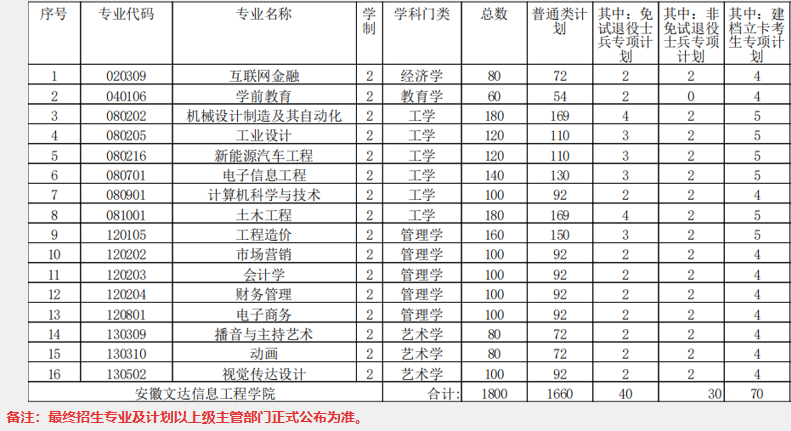 安徽文达信息工程学院2023年普通专升本分专业拟招生计划