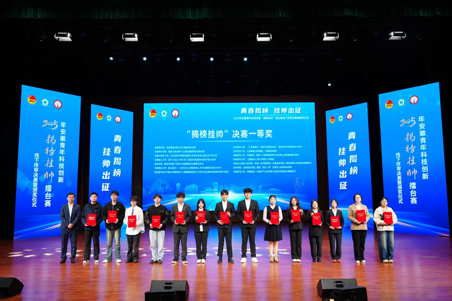 12月7日至8日,由团省委、省教育厅、省科技厅、省科协、省社科院、省学联联合主办的2025年安徽青年科技创新“揭榜挂帅”擂台赛线下终审复赛暨颁奖仪式在安徽交通职业技术学院(新桥校区)成功举办。我校在此次大赛中荣获省级一等奖1项、三等奖2项、优秀奖3项,实现了该项赛事成绩的新突破。