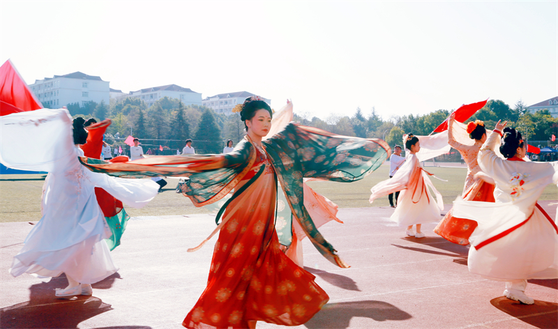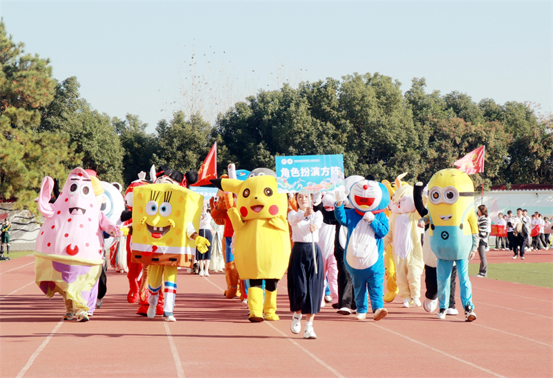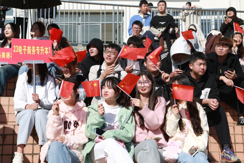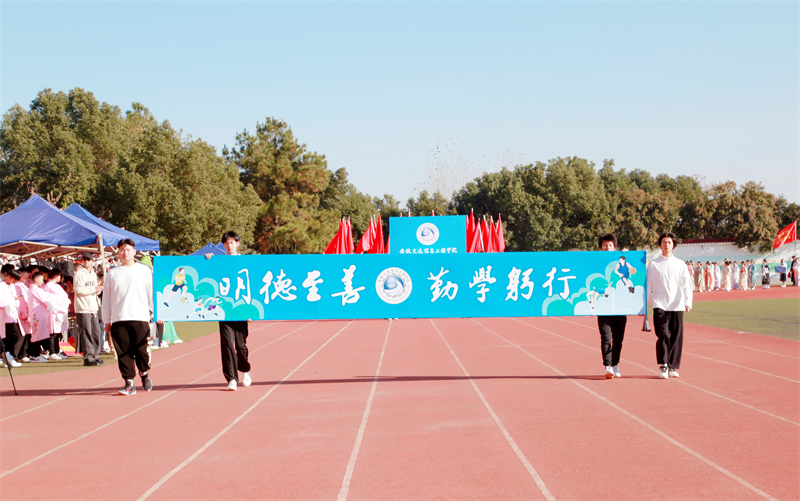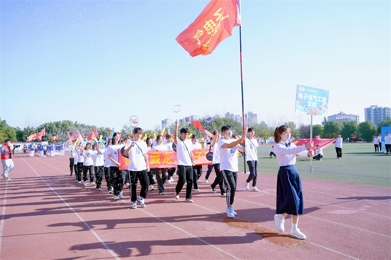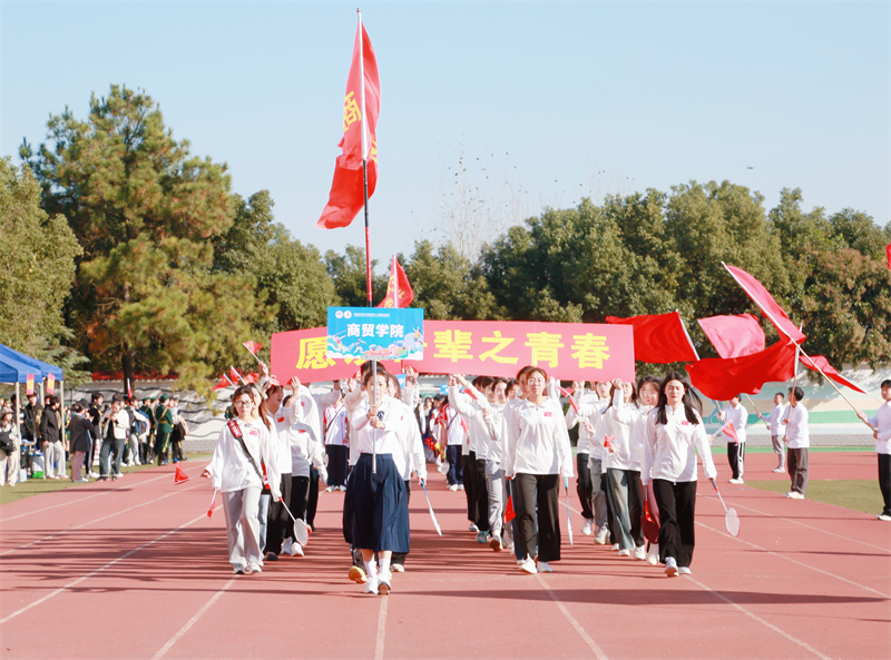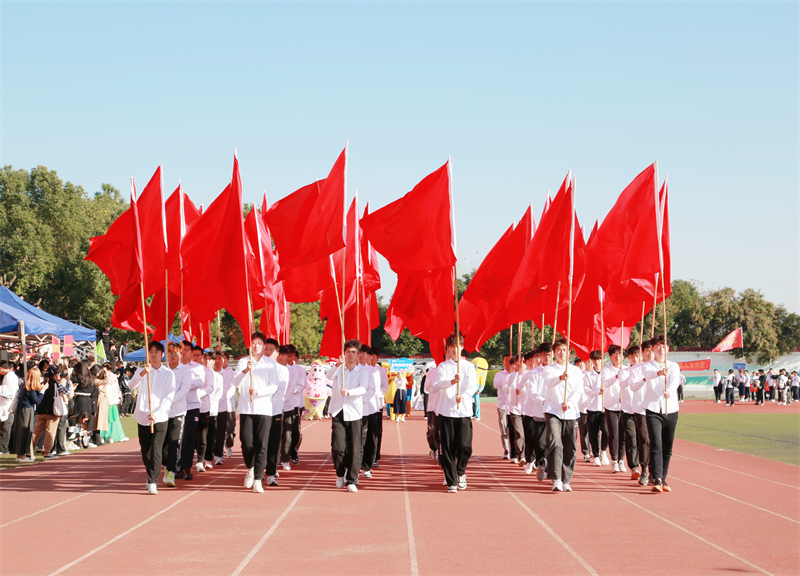 伴随着激昂的运动进行曲,国旗、校训、校徽、会徽方阵庄严入场,他们步伐矫健、眼神坚定,彰显着文达学子的信仰与力量。角色扮演方阵、汉服表演方阵、各二级学院代表队、教职工代表队和裁判员代表队依次入场,团结向上的标语、别出心裁的展板、舞动的鲜艳花束和迎风飘扬的红旗,欢快的旋律谱写着青春的诗篇。