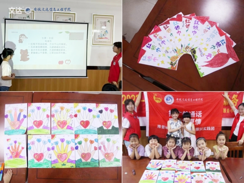 浸润童心,红色推普。“我们是共产主义接班人,迎着革命先辈的光荣传统,爱祖国,爱人民……”澎湃的《中国少年先锋队队歌》响彻整个课堂。队员陈蓉化身小老师,讲述了小萝卜头的故事,带领学生共同了解革命先烈的英雄事迹。通过学生们了解了《岳家军》的故事后也积极分享了自己知道的爱国小故事,每一句话都饱含了对爱国人士的敬佩与自豪。随后,陈蓉带领大家观看了《小兵张嘎》爱国影片,更是学习了毛泽东主席的作品《七律长征》,让学生们深刻意识到没有革命先烈的牺牲就没有现在的美好生活。在课程结束前,队员们还带领学生们一起绘制了《红领巾心向党》和《祖国在我心》的画作,小朋友们在欢声笑语中完成了绘画的同时,也在他们的心中埋下了一颗红色的种子。这些课程内容,不仅激起了小朋友们对社会主义祖国的无限热爱,更加坚定了对共产主义事业的信念,并激励着他们为国家的繁荣和民族的复兴而努力学习,奋发向前。