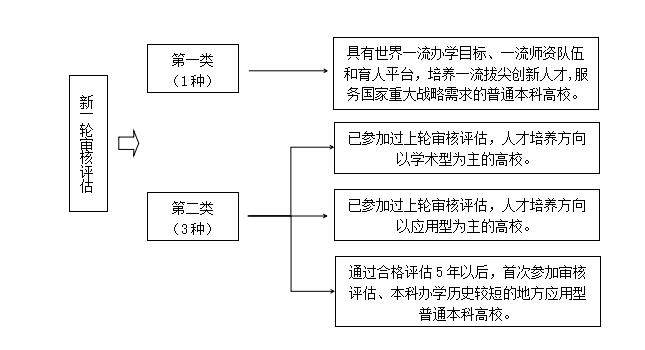 新一轮审核评估分为两类四种,详见下图。我校属于第二类的第3种。