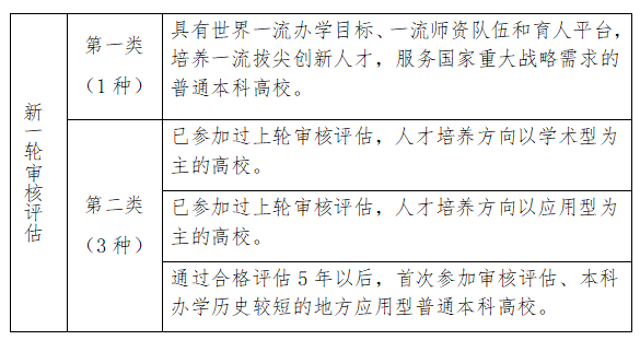 新一轮审核评估分为两类四种,详见下表。我校属于第二类第三种。