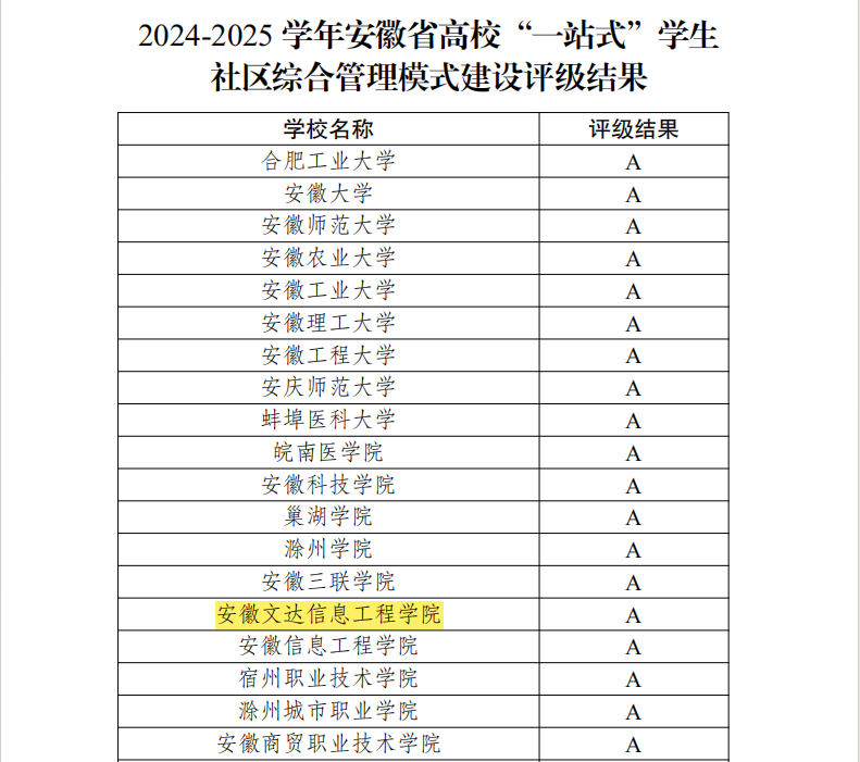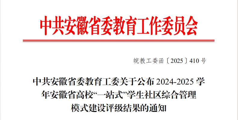近日,省委教育工委组织开展了2024-2025学年安徽省高校“一站式”学生社区综合管理模式建设评级工作。经过学校自评、专家评审、实地核查、评委会审议等多轮严格考核,安徽文达信息工程学院凭借扎实的建设基础、创新的工作举措和显著的育人成效,成功获评A级单位,跻身全省高校“一站式”学生社区建设第一梯队。