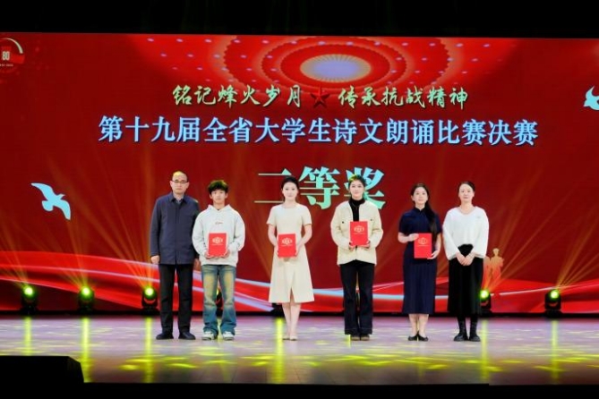 作为全省高校朗诵艺术领域的重要赛事,本届大赛吸引了全省多所高校的优秀团队同台竞技。比赛现场,艺术学院王泺珊、宋丹、胡广、赵王明、薛圆梦五位同学组成的参赛队伍,以饱满真挚的情感、富有感染力的演绎,带领观众回溯风雨如晦的峥嵘岁月。他们通过声情并茂的朗诵,生动诠释了艾青笔下土地的寒冷与坚韧、号角的嘹亮与牺牲、黎明的温暖与期盼,将作品的精神内核展现得淋漓尽致,其精彩表现深深打动了全场评委与观众,赢得阵阵掌声。