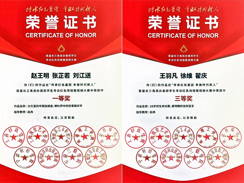 近日,由长三角民办高校党建与思政工作协作中心主办的“传承红色基因争做时代新人”首届长三角民办高校学生寻访红色场馆微视频大赛落下帷幕。我校学子凭借优秀作品脱颖而出,斩获多项荣誉,其中,《分贝里的中国加速度,喇叭声中的改革脚步声》荣获中一等奖,《28岁的生命壮歌,夏明翰的信仰宣言》荣获中三等奖,学校荣获“优秀组织奖”。