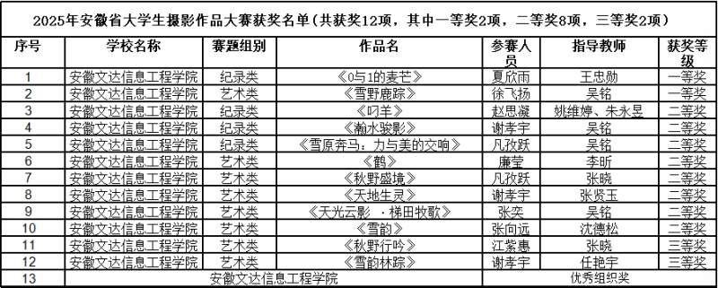 近日,2025年安徽省大学生摄影作品大赛获奖名单正式揭晓,我校艺术学院学子凭借扎实的专业功底与独特的创作视角斩获佳绩,共揽获12项荣誉,其中一等奖2项、二等奖8项、三等奖2项。同时,安徽文达信息工程学院荣获优秀组织奖,两位指导教师获评优秀指导教师奖,实现赛事荣誉大满贯,获奖数量与质量均位居同类院校前列。
