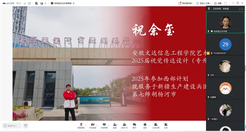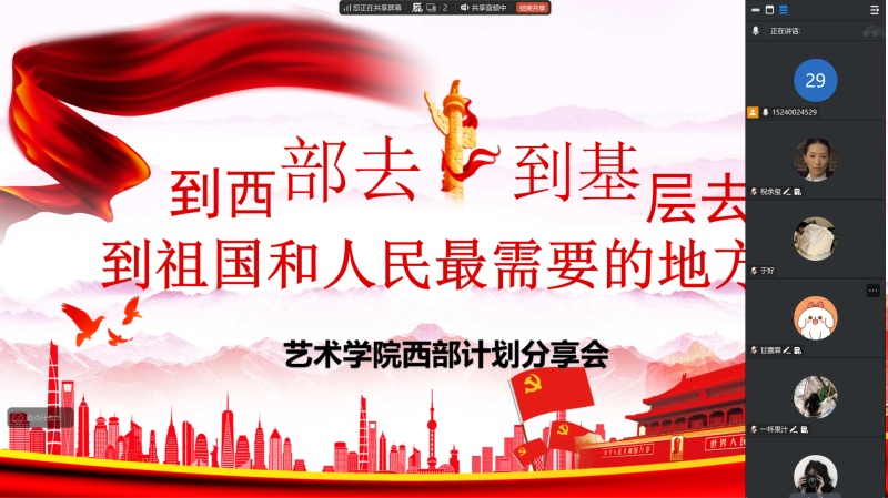 为引导和鼓励更多优秀青年学子投身西部建设,将个人理想融入国家发展大局,艺术学院组织了两场以“筑梦西部 青春启航”为主题的大学生志愿服务西部计划线上分享会。活动在广大学生中引起热烈反响,累计吸引近百名有意向的同学线上参与。