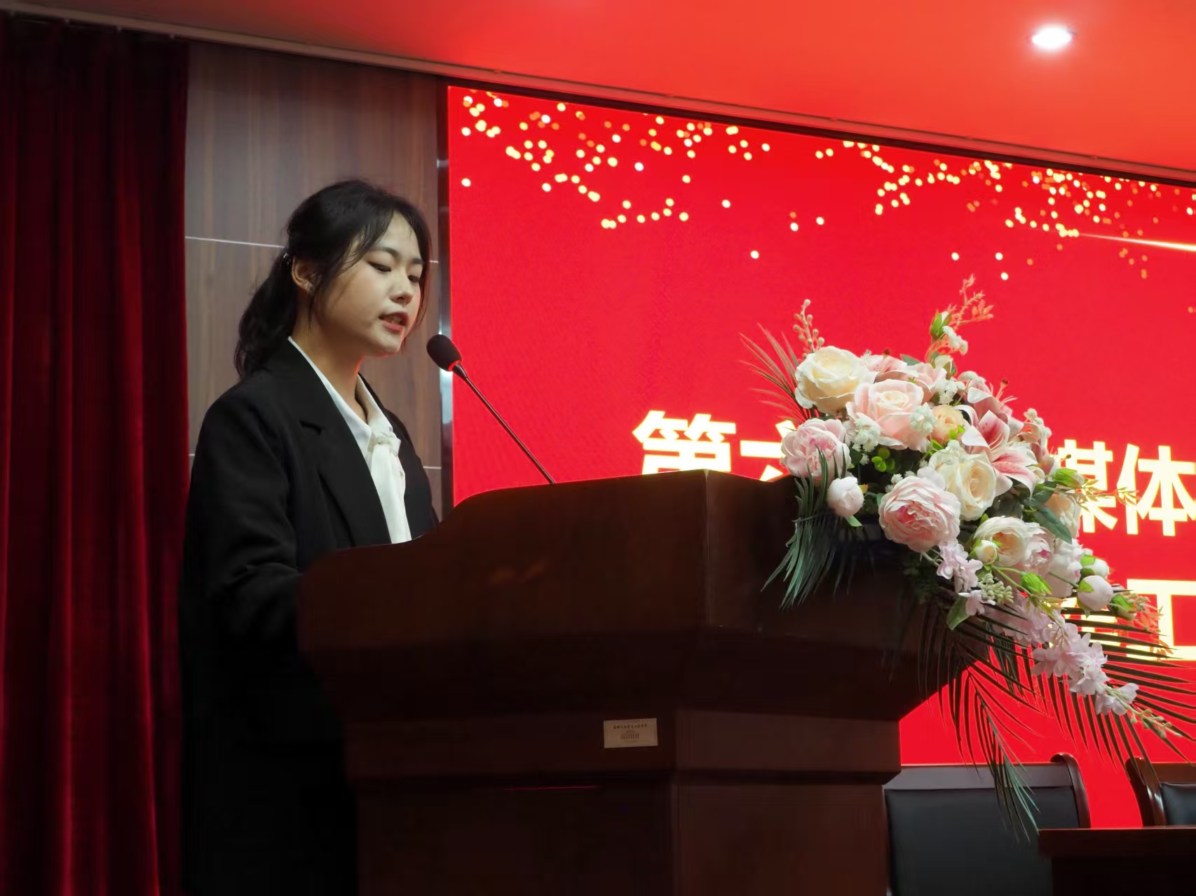 第六届融媒体中心主任徐文静作工作讲话。她表示,新一届团队将接续奋斗,聚焦主责主业,不断提升引领力与专业性,努力打造一支能力强、作风正的融媒体队伍,为讲好文达故事、传播校园正能量贡献青春力量。