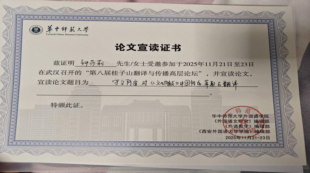 2025年11月21-23日,第八届桂子山翻译与传播高层论坛在武汉成功举办。我部教师钟莎莉老师应邀出席本次论坛,并与来自全国多所高校及研究机构的专家学者,就翻译与跨文化传播领域的前沿议题展开深入交流。