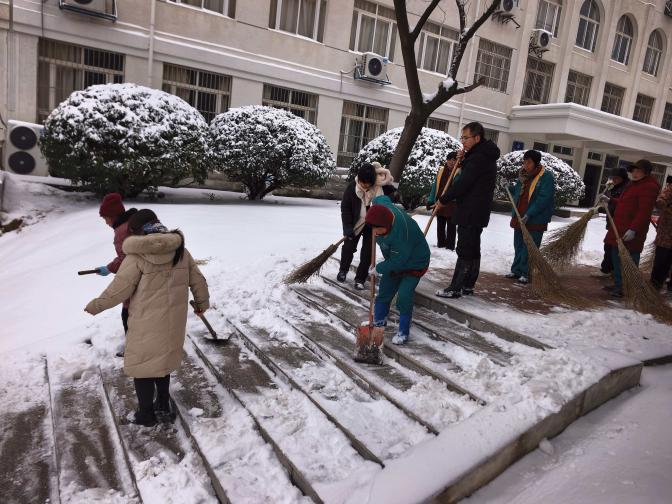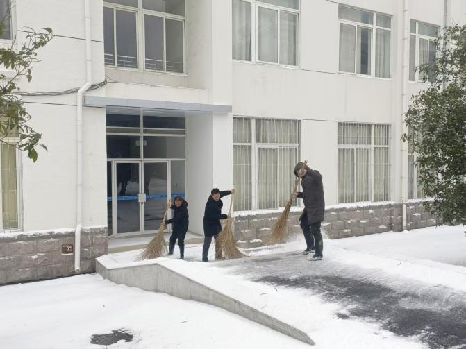 尽管气温低至零下6摄氏度,大家手持铁锹、扫帚等工具,不畏严寒、干劲十足。有人负责清扫主干道积雪,有人专攻台阶坡道除冰,还有人迅速铺设防滑地毯。校园里铲雪声此起彼伏,冰屑与雪花齐飞,一条条干净的道路、一级级清爽的台阶逐渐显现。