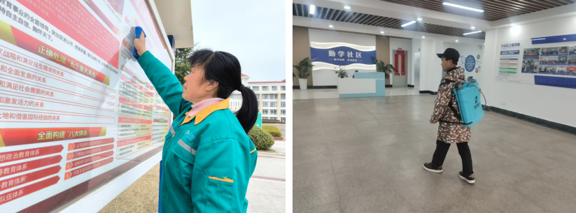 环境焕新,打造宜学宜居“新空间”。为营造整洁优美的校园环境,后勤物业公司开展“全覆盖、无死角”环境整治行动。组织保洁人员对教学楼、办公楼、学生公寓、主干道路等进行深度清洁,重点清理路面及绿化带杂草枯枝,擦净门窗玻璃、清洁楼梯扶手、清理卫生间卫生等,提前完成宿舍通风消杀和设施检查,为师生打造干净整洁的校园环境。