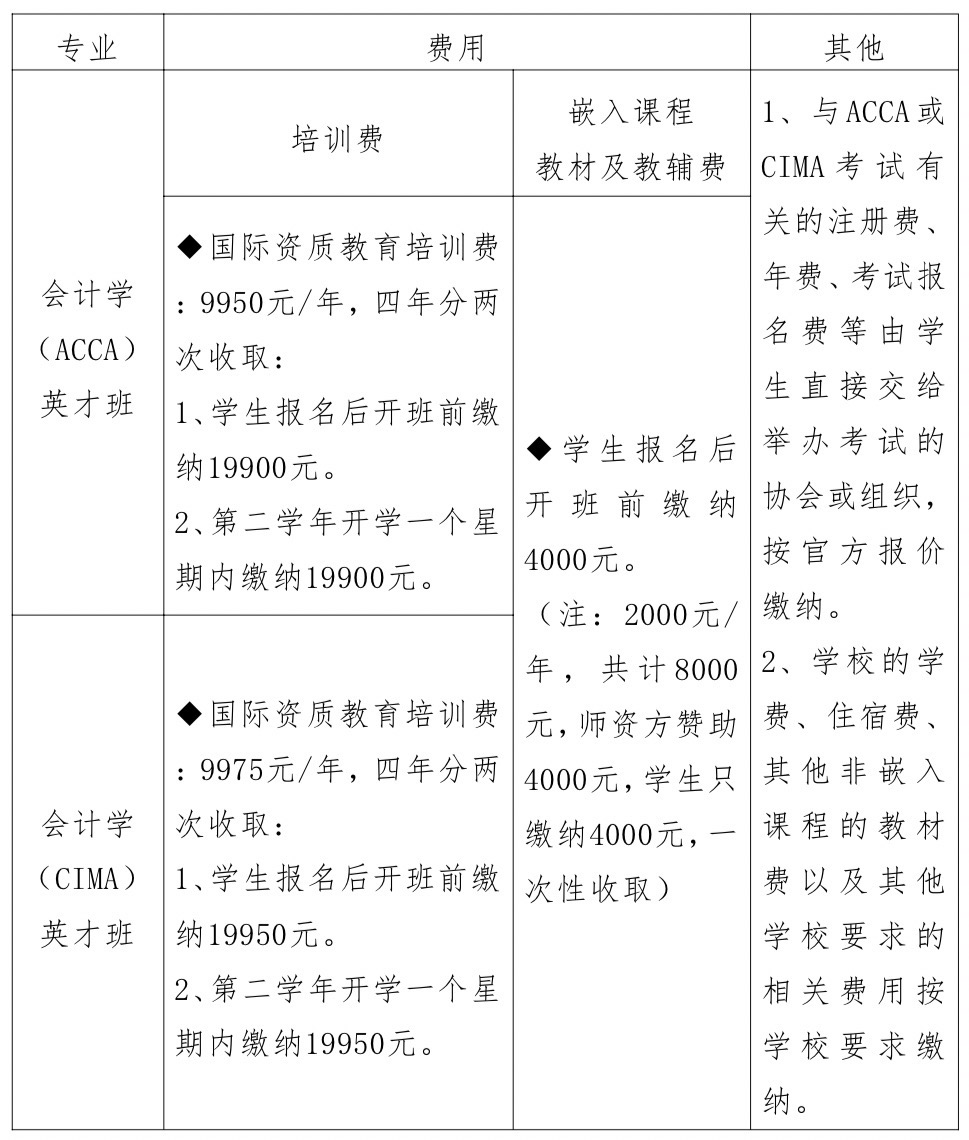 为培养基础理论扎实、综合素质高、创新能力强的国际化人才的要求,学校设立国际工商学院开设会计学(ACCA)英才班和会计学(CIMA)英才班,英才班人才培养方案将全球通考的课程嵌入到大学四年的人才培养方案中,采取国际化财会人才培养的精英教育模式,使学生在获得学校本科文凭与学位的同时,同时按照全球统一考试的结果,还可以获取全球认可的阶段性的权威行业执业资格证书。