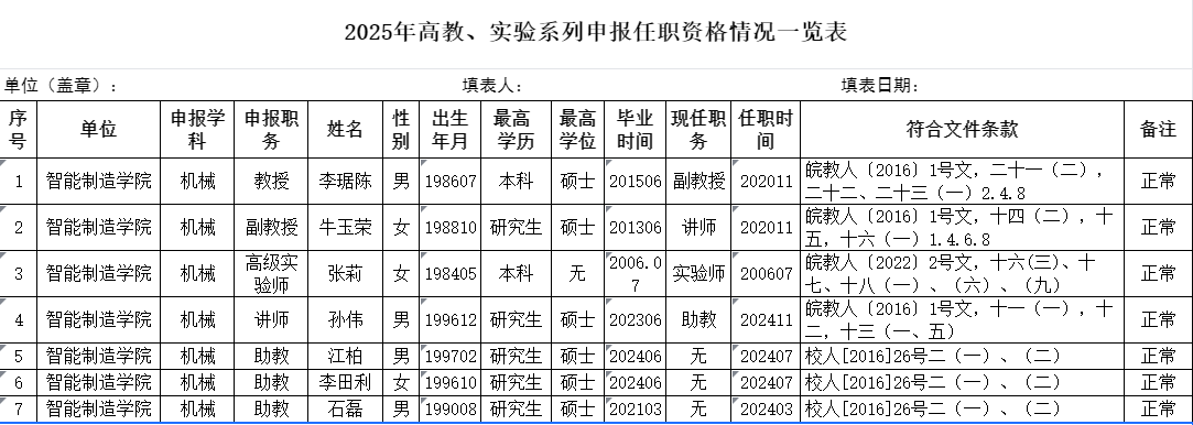 根据安徽省普通本科高等学校教师专业技术资格申报条件试行的通知(皖教人〔2016〕1号)、安徽省本科高等学校实验系列专业技术资格评审标准条件(皖教人〔2022〕2号)和校人[2016]26号文关于初级专业技术职务评审工作的意见、人函〔2025〕22号《关于2025年职称申报相关工作的通知》要求,经个人申请,学院职称评审委员会审核,拟同意李琚陈、牛玉荣等7名人员职称申报,现将拟认定符合条件人员名单公示如下: