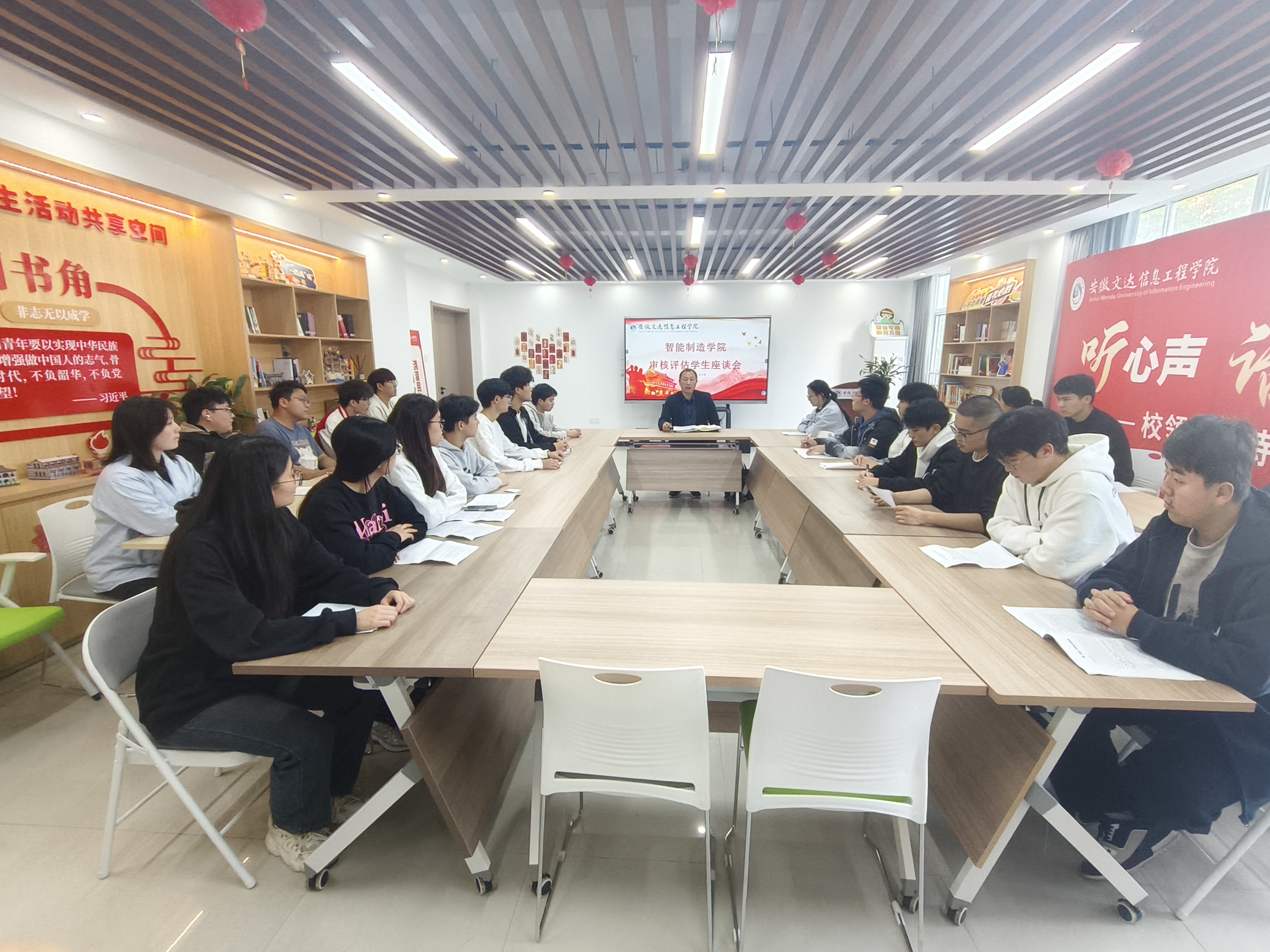 11 月 5 日,智能制造学院在勤学社区召开审核评估学生座谈会,副院长彭玉马主持会议,30 余名不同年级、专业的学生代表参会,旨在倾听心声、收集建议,扎实推进迎评促建工作。