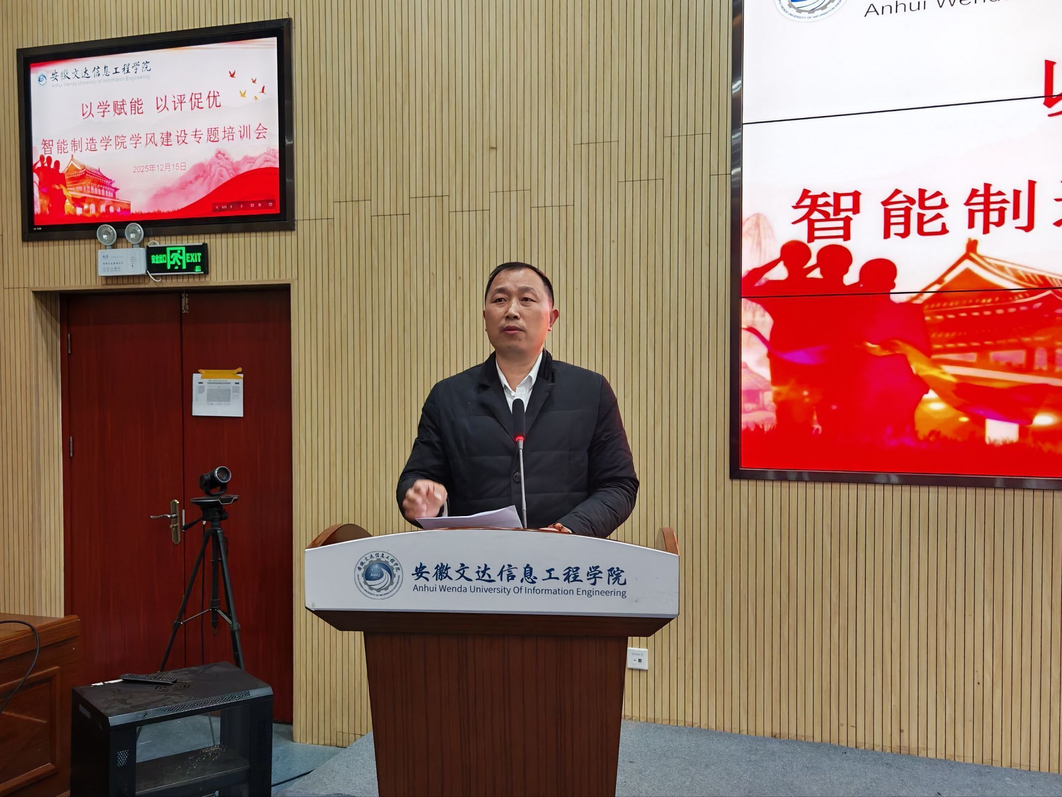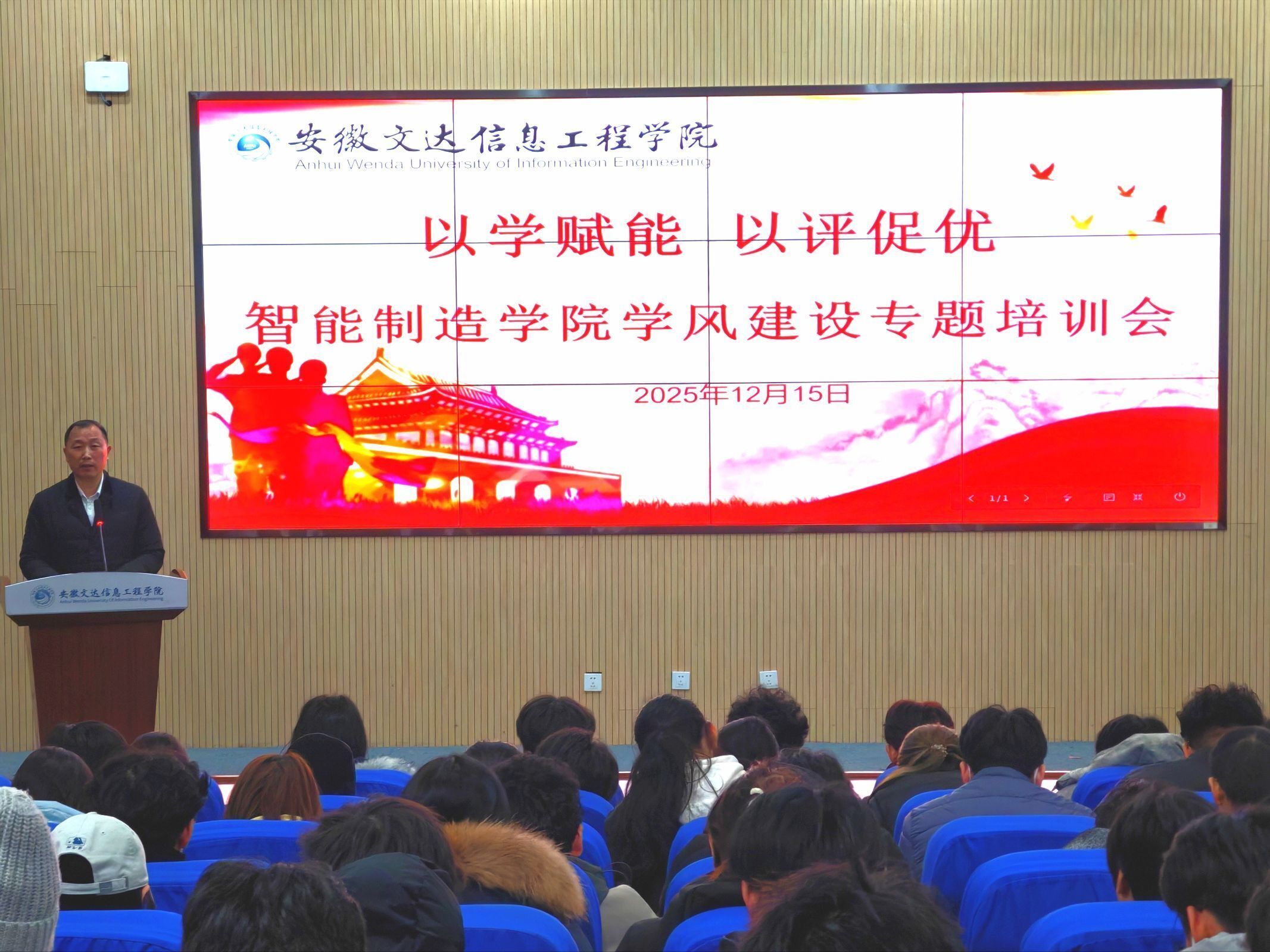 为扎实推进迎评促建工作,强化学院学风建设,明确学生骨干迎评责任,12 月 15 日,智能制造学院在文鼎楼多功能厅召开 “以学赋能 以评促优” 学风建设专题培训会。学院副院长彭玉马担任主讲人,各班级学生干部、党员参加了培训。