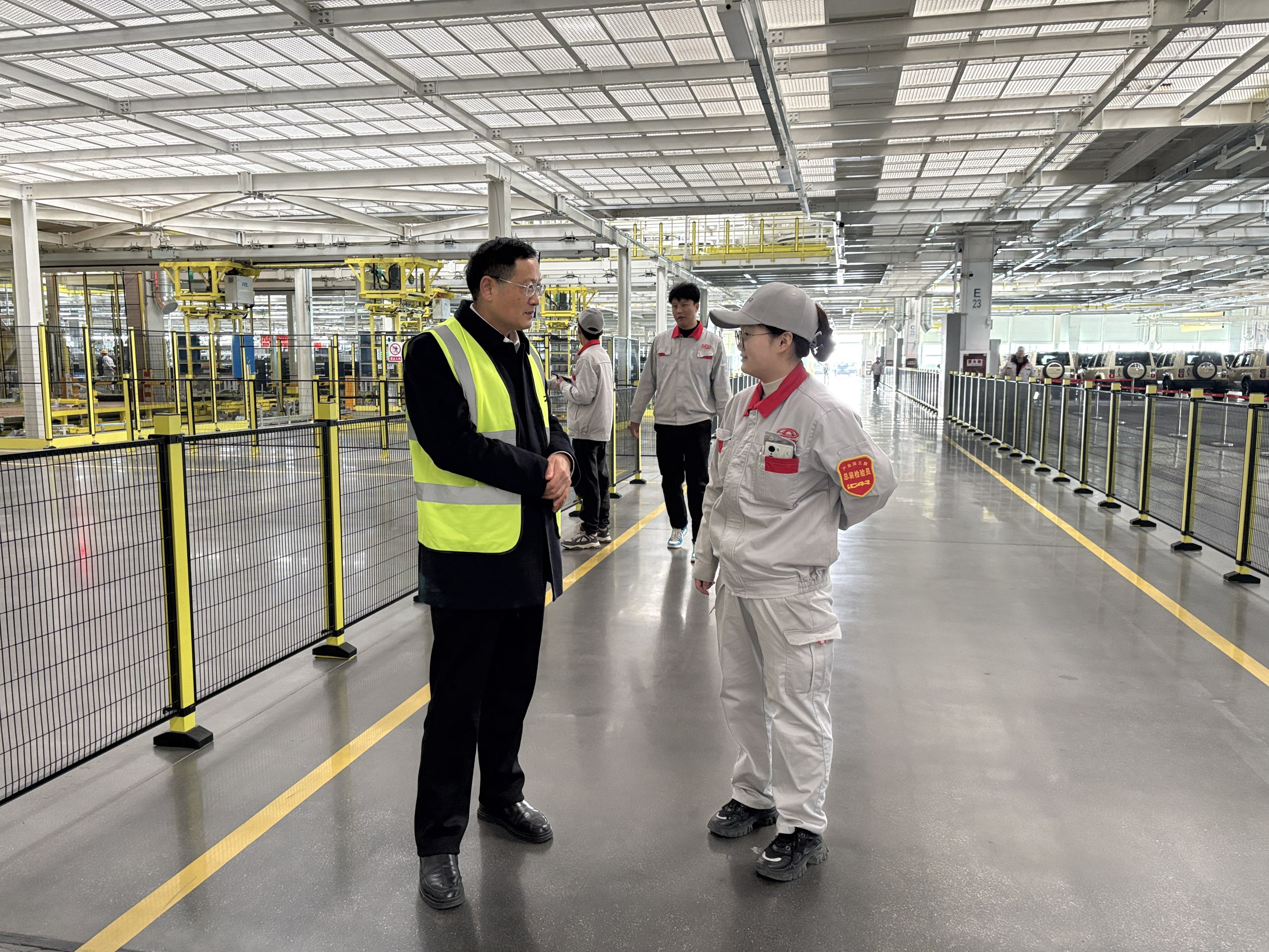 在奇瑞新能源汽车智能工厂内,张家玺一行实地考察了总装、涂装、焊装等核心车间,详细了解学生的实习岗位分布、工作内容及生活保障情况并与学生深入交流,询问其技能掌握进度与岗位适应情况。