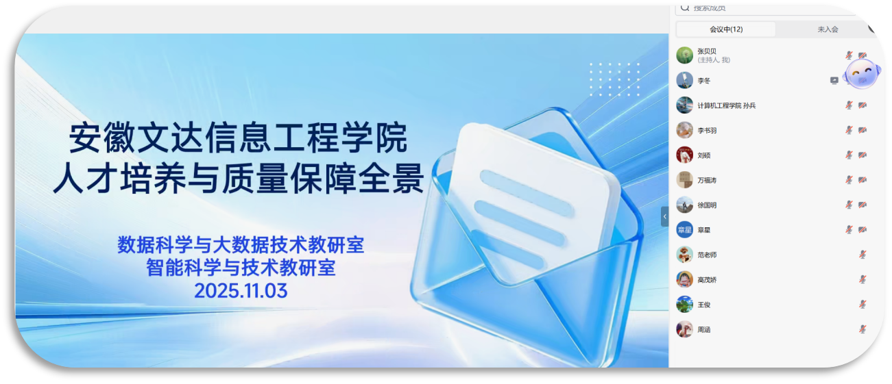会上,全体教师共同学习了《安徽文达信息工程学院人才培养与质量保障全景》最新解读材料,围绕“办学定位与特色、三起来一出去机制、应用型培养路径、质量保障闭环、落地与提升建议”五个模块深入讨论。李冬结合2024级人才培养方案,重点讲了“平台+模块”课程结构,以及如何落实“实践学分不低于35%”;智能科学与技术教研室主任张贝贝,则从“课程—项目—竞赛”闭环角度,分享了近三年指导学生拿省级以上奖项的经验与案例。
