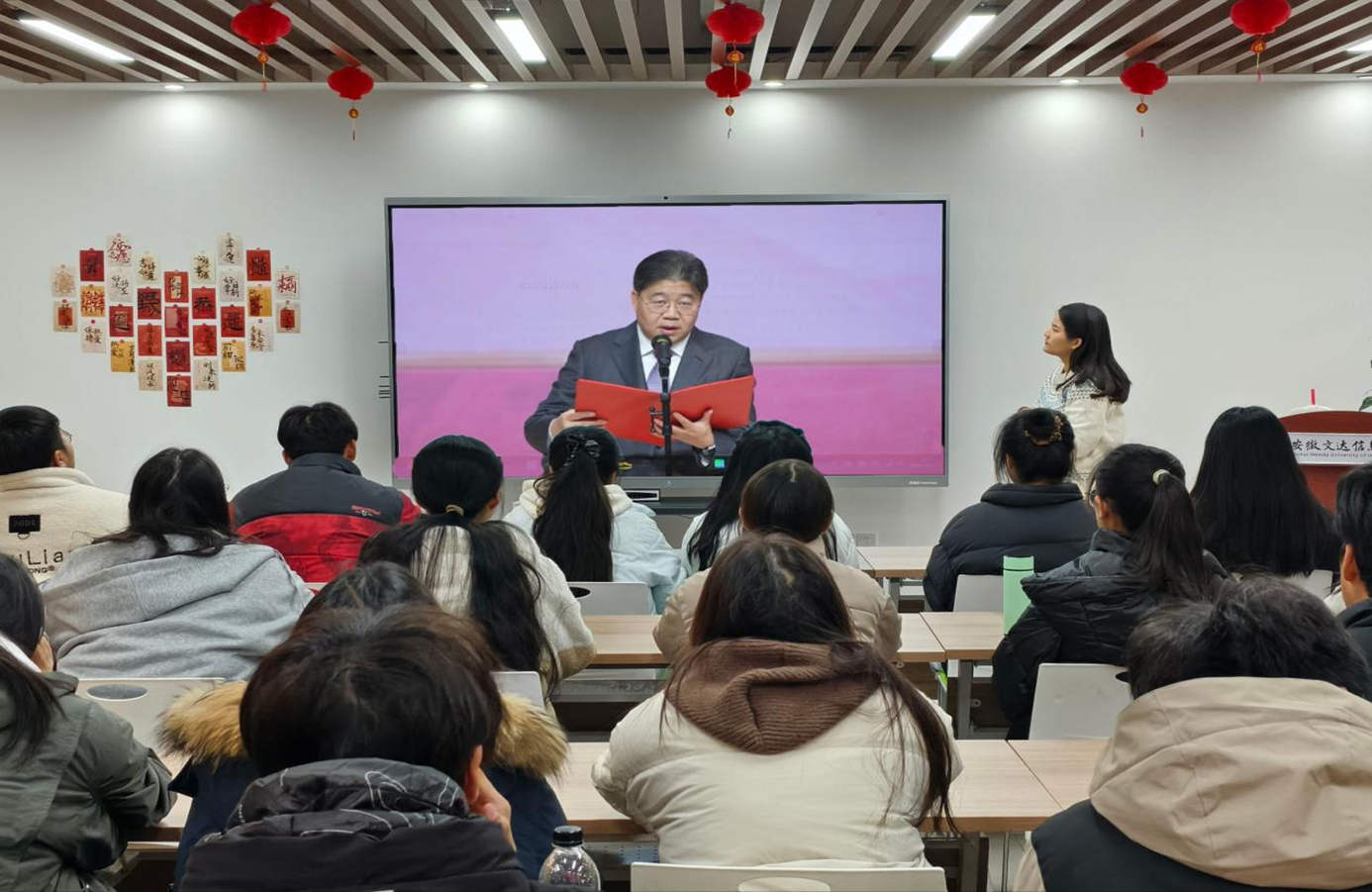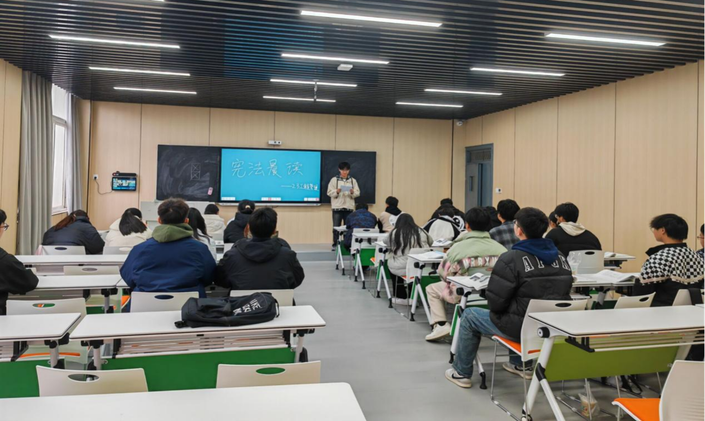 当日上午10时,教育部主办的2025年国家宪法日教育系统“宪法晨读”全国主会场直播开播。学院各班级代表在勤学社区同步参与学习。庄严的升旗仪式点燃爱国热情,宪法核心条文的琅琅书声传递法治尊崇,合唱《宪法伴我们成长》更将现场氛围推向高潮,让同学们深切感受宪法与成长的紧密联系。直播结束后,班级思政委员结合校园案例解读条文,通过“领读+跟读+提问”的互动形式,让抽象法律知识变得生动易懂。