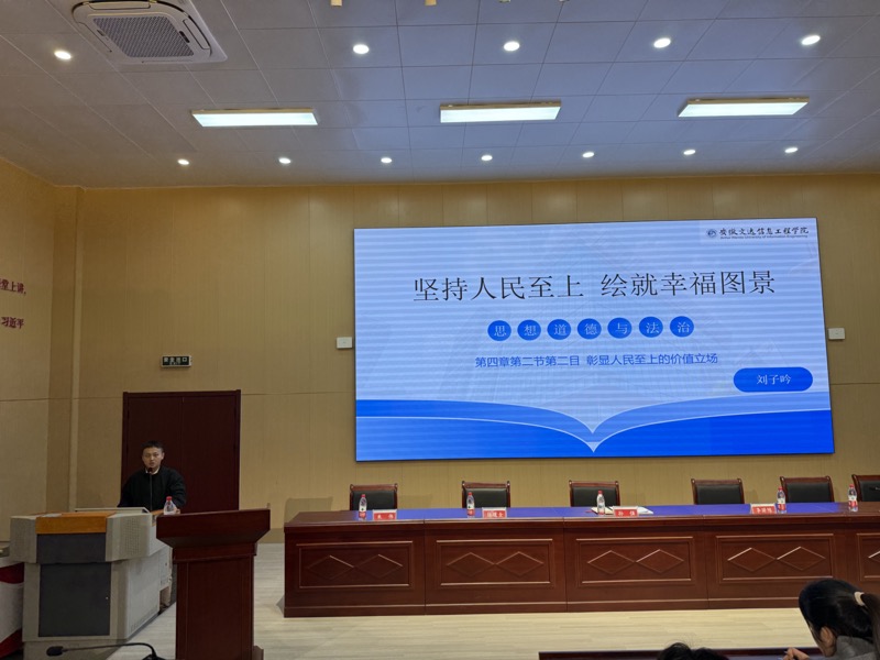 马克思主义学院教师刘子吟以“坚持人民至上 绘就幸福图景”为题进行说课,围绕指导思想、教材分析、学情分析、教学目标及重难点、教学过程及方法、教学内容六个方面系统阐述,将“人民至上”理念与教学实践紧密结合,展现了思政课扎根现实、服务育人的鲜明特色。