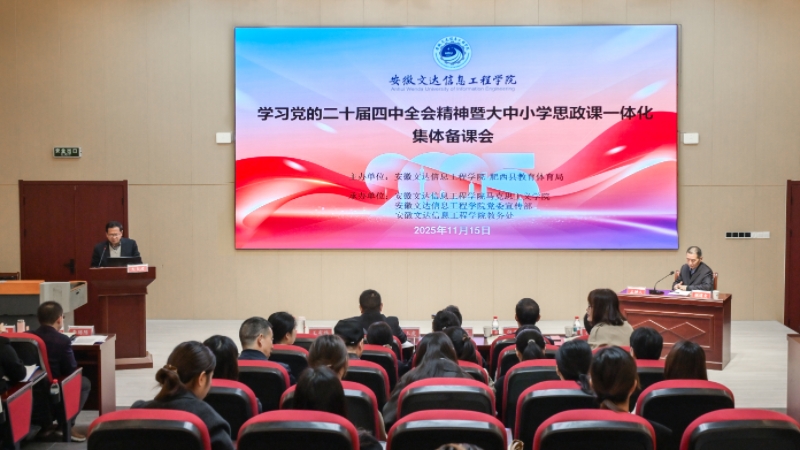 11月15日,学习党的二十届四中全会精神暨大中小学思政课一体化集体备课会在安徽文达信息工程学院举行。活动由安徽文达信息工程学院与肥西县教育体育局联合主办,学校党委副书记、副校长、纪委书记唐立军,肥西县教育体育局督学梁玉虎,合肥市教育科学研究院正高级研究员侯新旺,安徽外国语学院马克思主义学院院长王有炜,徽商职业技术学院马克思主义学院副院长张林,合肥市南门小学党委副书记、校长何炜及多所高校、教育主管部门及肥西县大中小学的专家、一线思政教师齐聚,共商思政育人路径,推进区域思政课一体化建设。