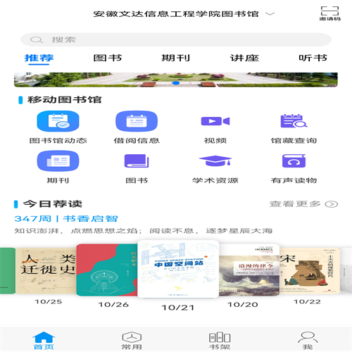 包括移动图书馆的通用模块,如图书馆动态、借阅信息、馆藏查询、视频、期刊、图书、学术资源、有声读物等