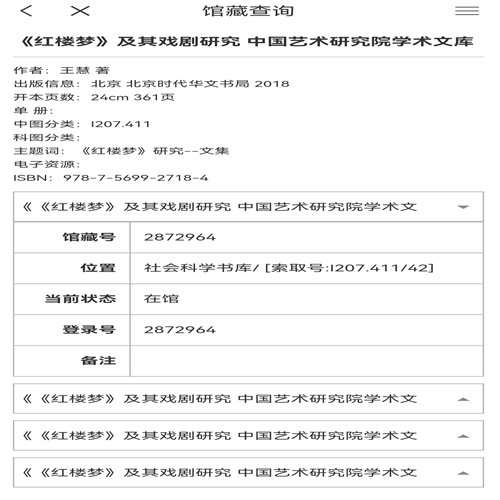 馆藏查询:查看图书馆纸质图书在架信息以及当前状态书否可借