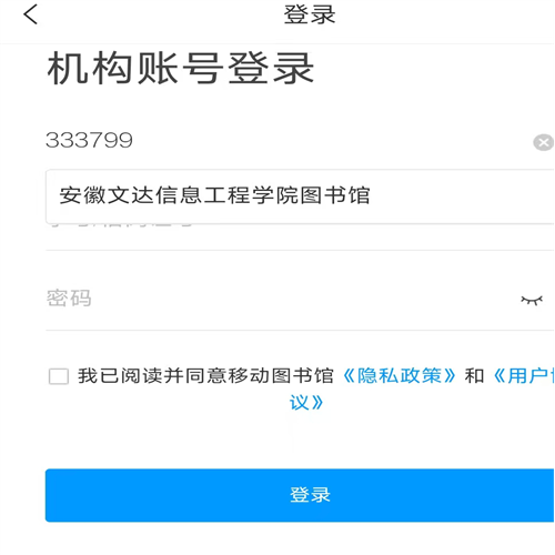 第三步:选择“机构账号登录”,输入“333799”或“安徽文达信息工程学院图书馆”后选择弹出的点击