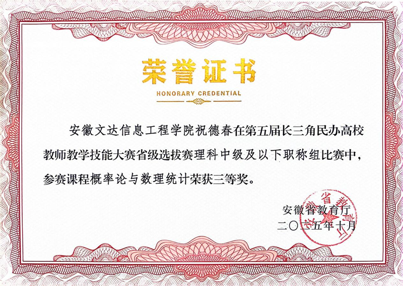 近日,第五届长三角民办高校教师教学技能大赛安徽省赛区选拔工作圆满落幕。该赛事作为贯彻落实长三角教育一体化战略的重要平台,聚焦真实课堂教学需求,对教师教学能力进行全方位考察。我院数学教研室祝德春老师凭借扎实的教学功底、创新的教学实践与长期深耕教学的不懈付出,在理科中级及以下组比赛中荣获三等奖。