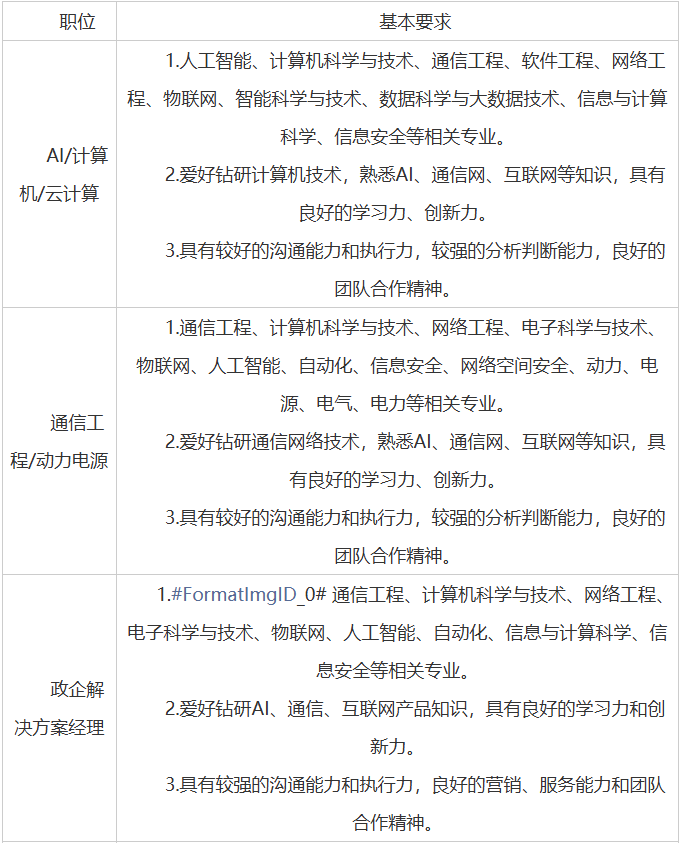 招聘职位:涵盖AI/计算机/云计算、通信工程/动力电源、政企解决方案经理、财务管理等相关职位。