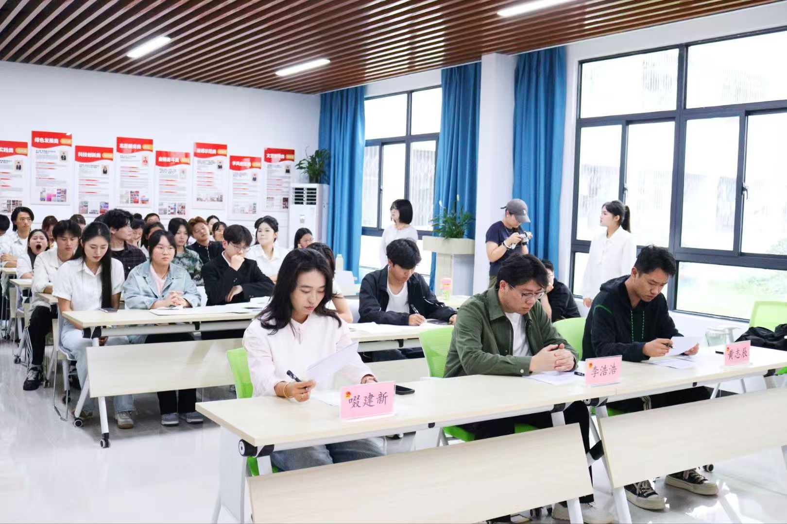 为深入学习贯彻习近平新时代中国特色社会主义思想,全面落实习近平总书记《激励新时代青年在中国式现代化建设中挺膺担当》重要文章和关于青年工作的重要论述精神,9月24日,校团委在一站式学生社区举办第八届“中海地产杯”安徽省大学生主题演讲比赛校赛。校团委老师黄志辰、李浩浩、啜建新担任评委。