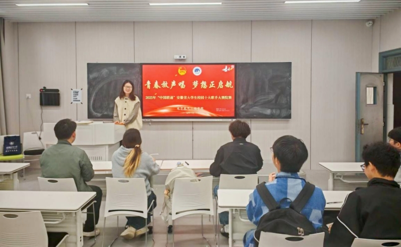 10月20日,由电子电气工程学院举办的 “青春放声唱 梦想正启航” 2025年中国联通安徽省大学生校园十大歌手大赛院赛在天佑106教室激情开唱。14 位选手齐聚舞台,以歌声诠释青春理想,用旋律奏响时代华章。