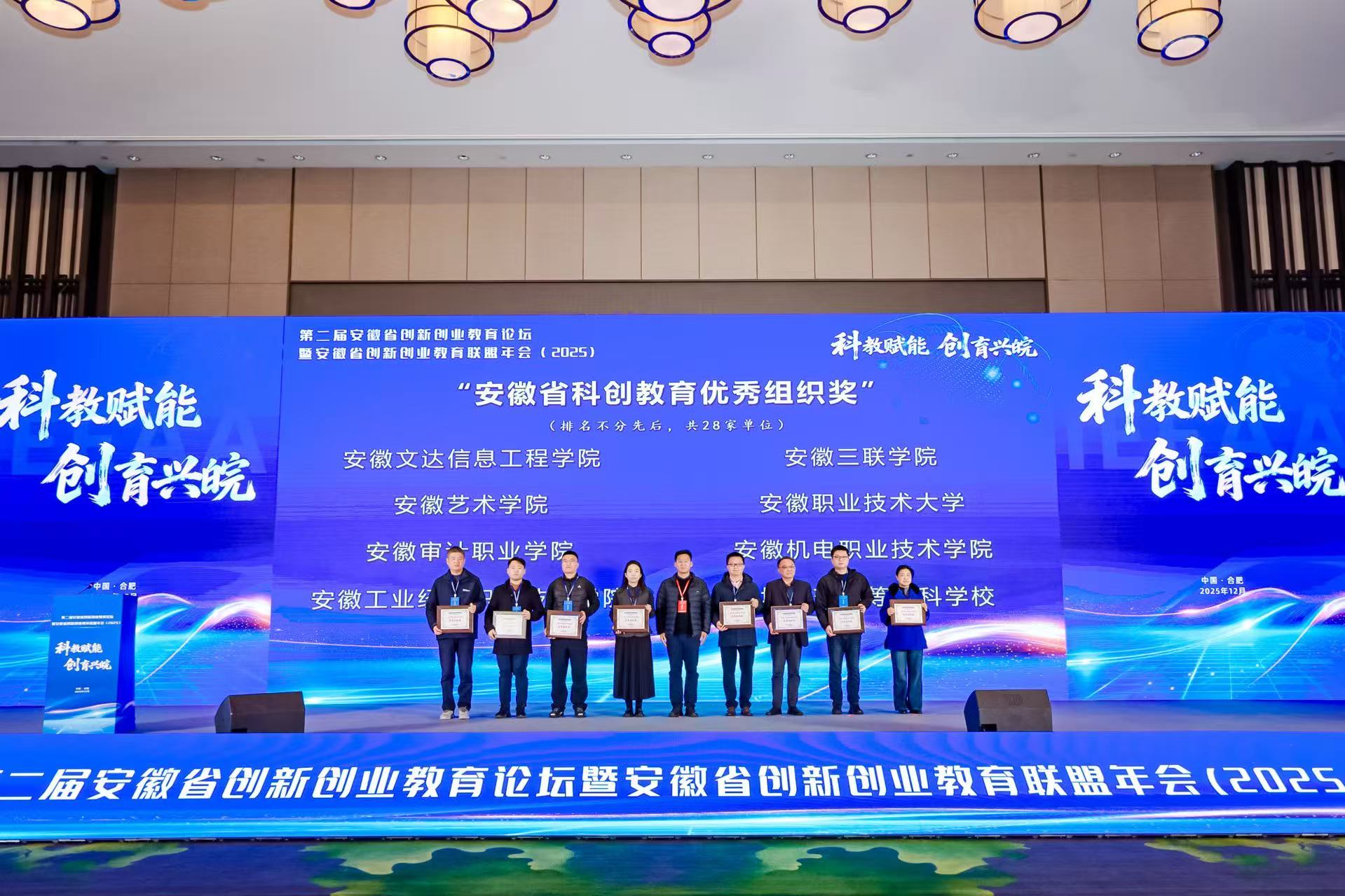 本次论坛以“科教赋能,创育兴皖”为主题,围绕创新创业课程体系建设、实践平台搭建、师资培养与项目孵化等议题展开深入交流。在联盟大会表彰环节,会议公布了2025年度安徽省创新创业教育相关表彰名单。我校在联盟单位中荣获“2025年度安徽省科创教育优秀组织奖”,1名教师获评“安徽省中级科创导师”荣誉称号。两项荣誉的获得,是安徽省创新创业教育联盟对我校创新创业教育工作的充分肯定,也彰显了我校在科创人才培养领域的持续深耕。