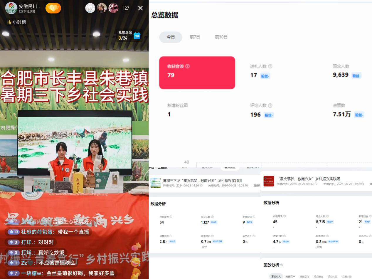 勇毅前行,用青春奏响人才赋能协奏曲。实践团成员发挥专业优势,借助新媒体平台,以电商直播和短视频宣传的方式落实数字助农计划。实践期间,同学们在朱巷镇农产品展示区策划开展了三场直播助农专项活动,把手机作为“新农具”,将短视频+直播带货作为“新农活”,纷纷变身“卖货郎”,帮助朱巷有机稻虾米、菜籽油、“双河三宝”、月亮湾特酿黄豆酱、金丝皇菊等农产品登上电商舞台。直播累计点赞量超16.8万次,累计观众数超2.1万人,形成了良好的品牌传播效应,实现了凭借“小屏幕”打开“大市场”的营销目标。