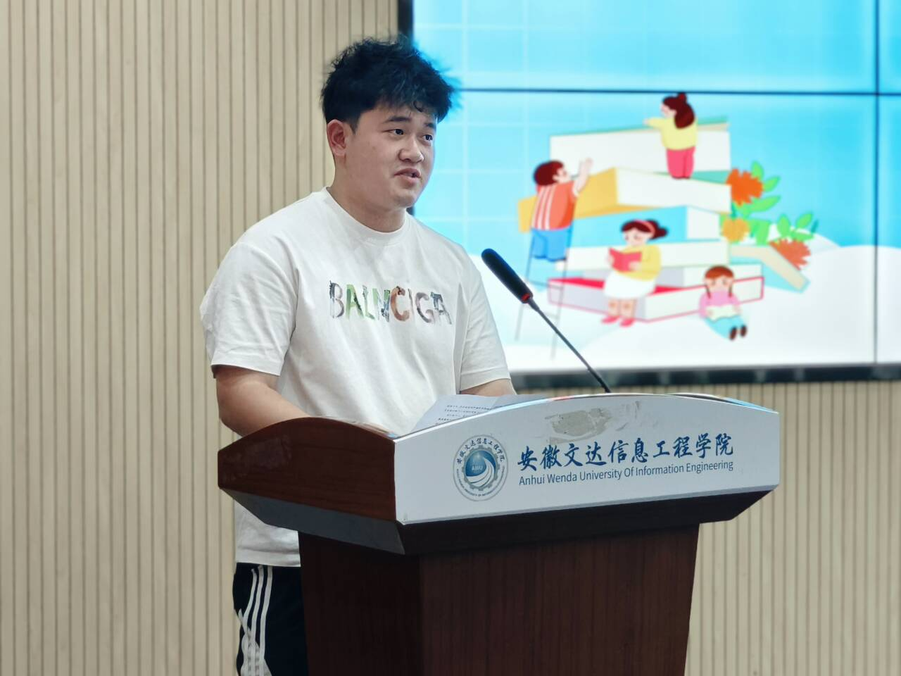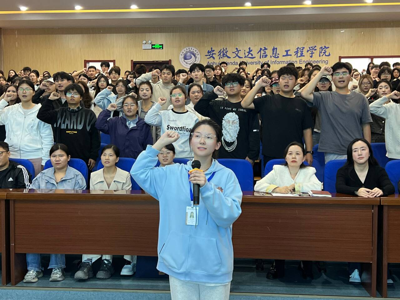 启动仪式在充满仪式感的倒计时中拉开帷幕。全场灯光渐暗,师生手持“星光”共同倒数,象征着艺术学院全体师生汇聚力量,携手点亮学风建设的新征程。仪式伊始,寄语与承诺点亮初心,鲁孟老师以“一盏灯”的故事,分享了关于指引、坚守与启迪的深刻寓意,温暖而富有哲理的讲述引发了在场师生的共鸣。随后进行的“‘接力麦’的承诺”环节,学生骨干们踊跃发言,纷纷许下“为了更好的学风,我可以……”的庄严承诺,展现了同学们从我做起、共建优良学风的决心。接着同学们齐声朗读《学风契约》,铿锵有力的誓言在会场回荡,将开场环节推向高潮。