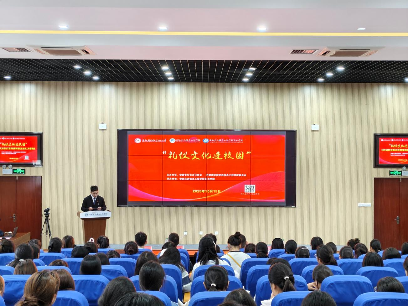 为积极响应学院关于加强学风建设的号召,深入推进校园精神文明建设工作,引导广大同学内强素质、外塑形象,营造积极向上、文明和谐的校园环境,10月15日我院在文鼎楼三楼多功能厅举办校园文明礼仪专题讲座,讲座特邀安徽省礼仪文化协会的专家担任主讲,各班级学生代表共同聆听学习。