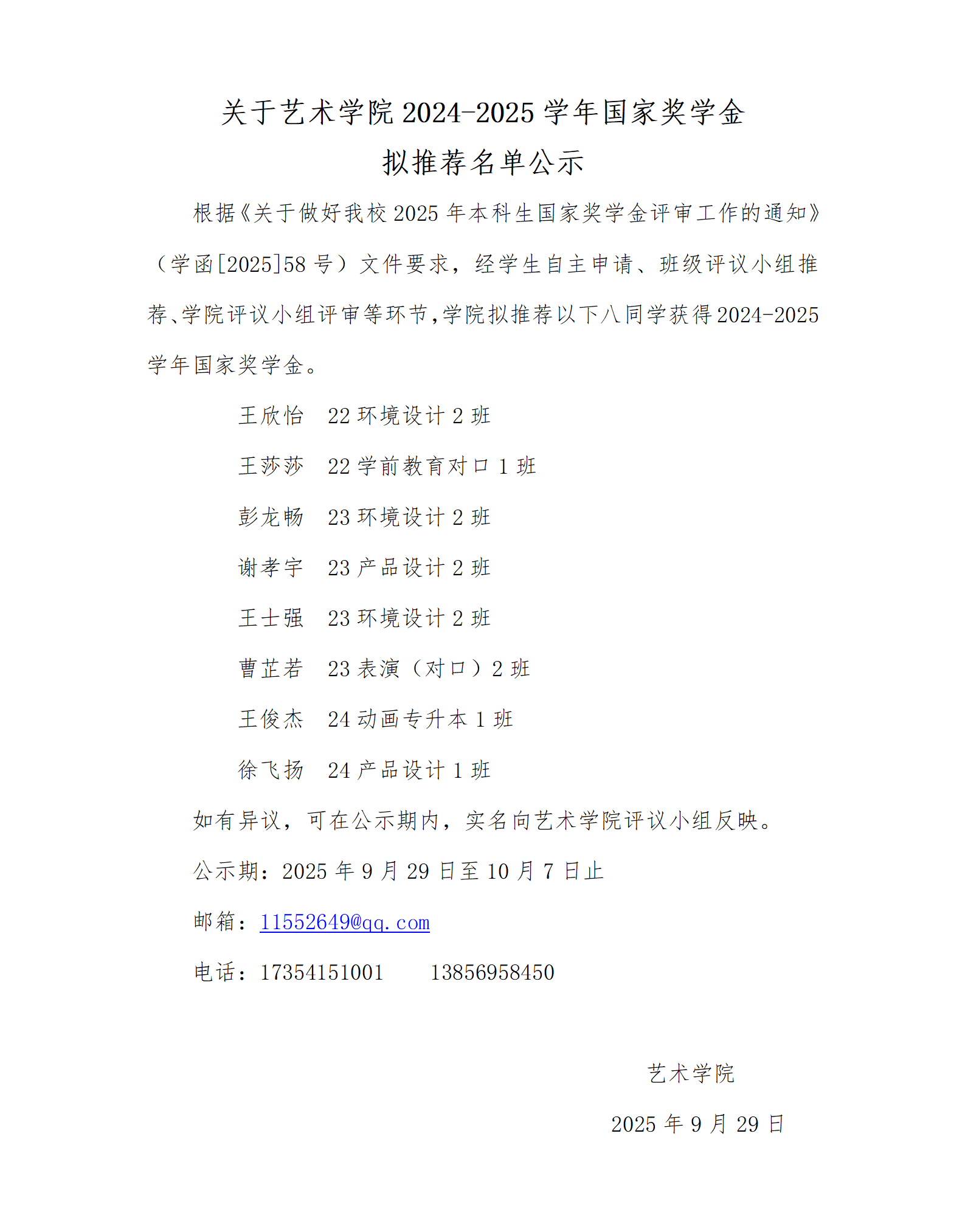 关于艺术学院2024-2025学年国家奖学金拟推荐名单公示
