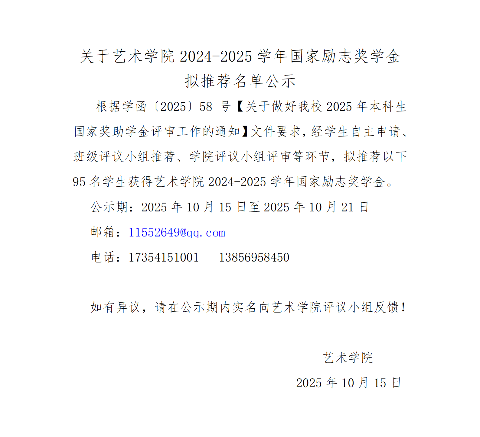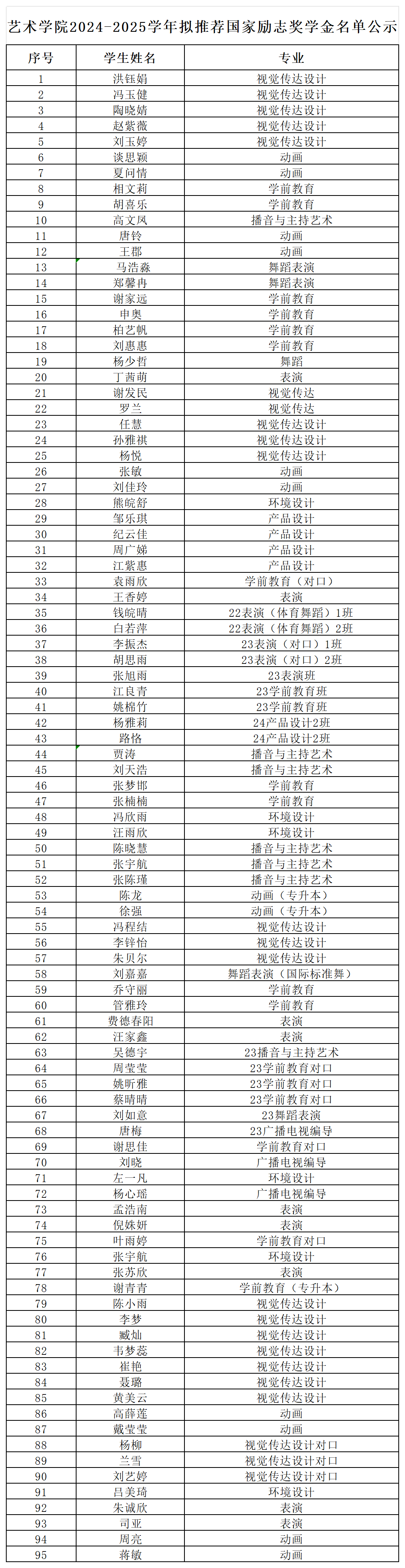 关于艺术学院2024-2025学年国家励志奖学金拟推荐名单公示