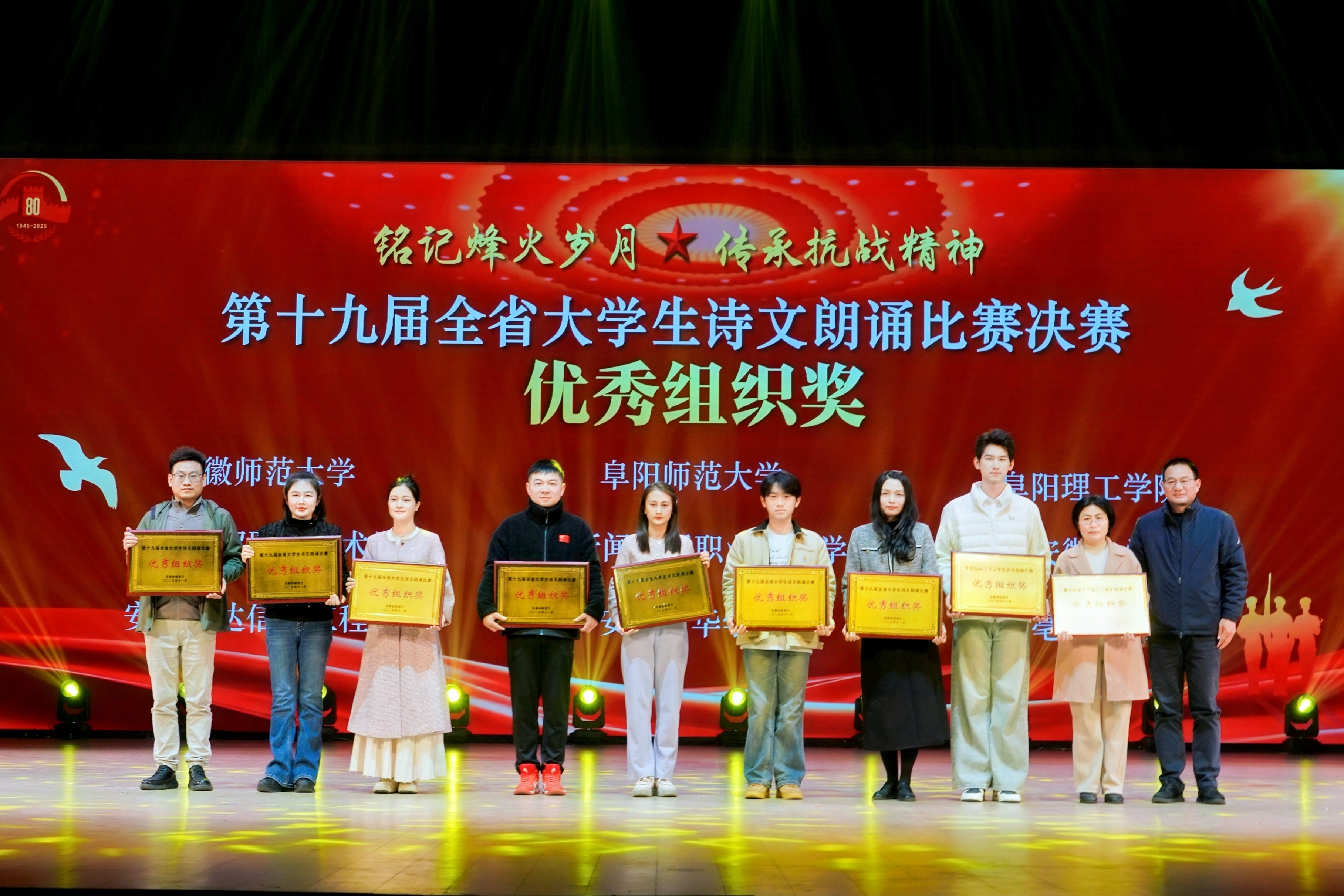 11月26日至28日,由安徽省教育厅主办、安徽师范大学与安徽省朗诵艺术学会联合承办的第十九届全省大学生诗文朗诵比赛决赛在安徽师范大学圆满落幕。我院播音与主持艺术专业学子表现亮眼,勇创佳绩。原创作品《艾青组诗》荣获专业组二等奖,《向太阳(节选)》《额尔古纳河右岸(原创)》双双斩获专业组三等奖;同时,我校因组织工作出色,荣获“优秀组织奖”。