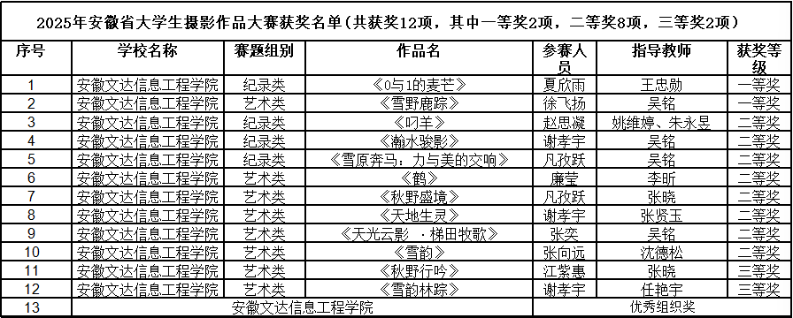 近日,2025年安徽省大学生摄影作品大赛获奖名单正式揭晓,我院学子凭借扎实的专业功底与独特的创作视角斩获佳绩,共揽获12项荣誉,其中一等奖2项、二等奖8项、三等奖2项。与此同时,安徽文达信息工程学院荣获优秀组织奖,两位指导教师获评优秀指导教师奖,实现赛事荣誉大满贯,获奖数量与质量均位居同类院校前列。