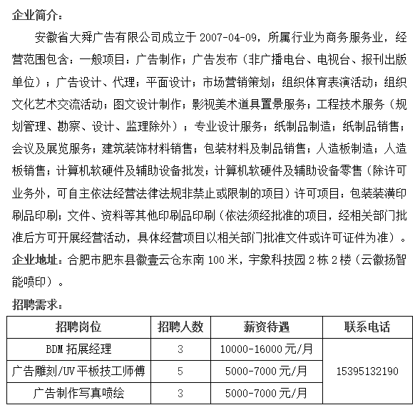 招聘I 安徽省大舜广告有限公司