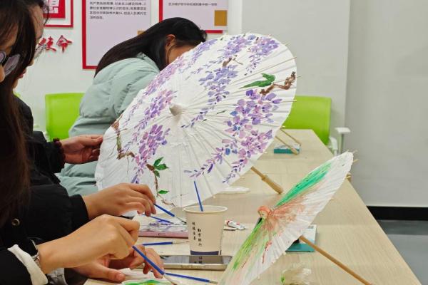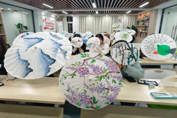 创作环节中,同学们迫不及待地拿起彩绘笔,或参考素材汲取灵感,或自由发挥畅想创意,在素净的伞面上勾勒山水、点染花草,构建起属于自己的小诗意。现场氛围温馨又热闹,创作时大家互相分享颜料、指点技法,专注的模样让非遗创作更有温度。