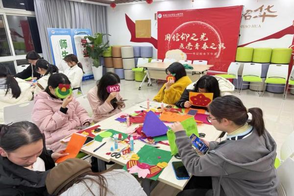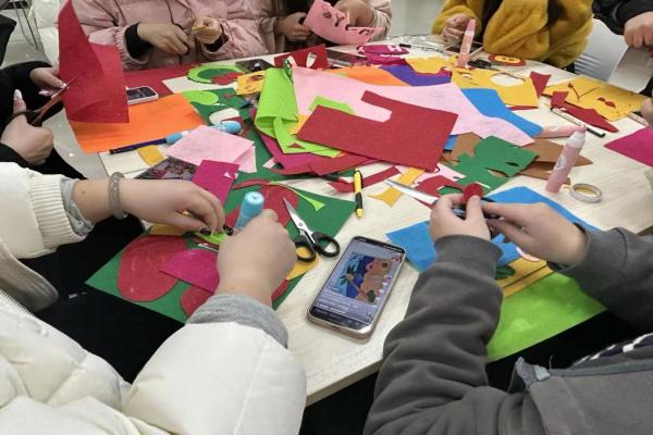 活动现场,工作人员为大家准备了色彩丰富的不织布、安全剪刀、胶棒、胶水等工具。在简单的技巧讲解后,大家纷纷动手,先对照纸样裁剪出不织布部件,再用胶棒小心拼接、粘贴。从勾勒轮廓到组合造型,同学们专注地处理每一个细节,有的还根据自己的喜好调整配色和装饰,让小小的不织布片在指尖变成独一无二的小物件。