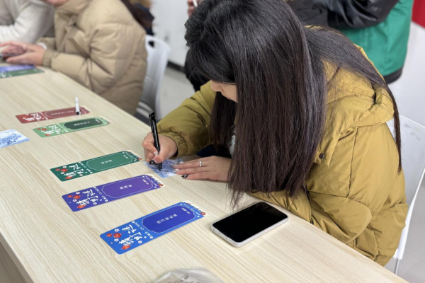 在答题区,同学们或低头沉思,或小声讨论,在谜题与答案之间不断推敲。工作人员在现场适时给予类别提示,引导大家拓宽思路。完成作答后,同学们前往兑奖区核验答案并领奖,让每一位参与者都能在活动中有所收获。活动尾声,同学们手持奖品或谜题卡片合影留念,并用便签写下自创灯谜贴于灯谜打卡墙,与他人分享创意与巧思。活动结束后,部分优秀原创灯谜将在社区公众号上进行展示与推广,进一步扩大活动影响力。