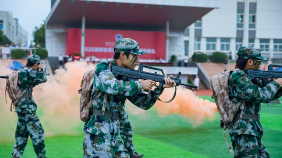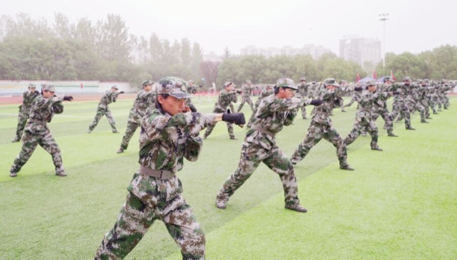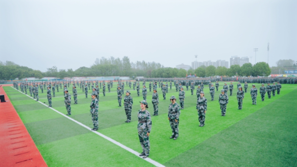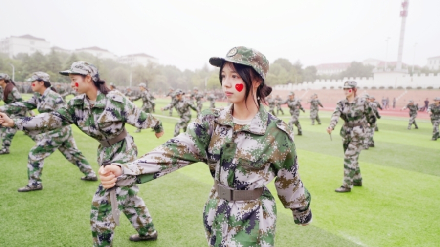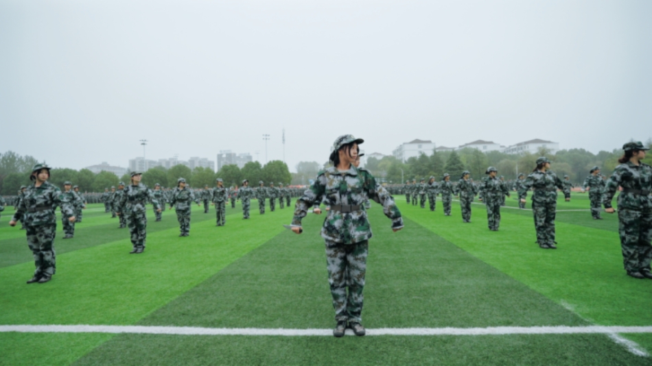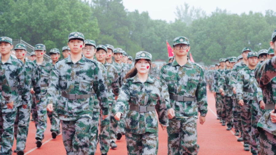 谢春贵宣布军训成果展示正式开始。2025级新生身着迷彩服装,身姿挺拔、英姿飒爽。他们昂首阔步向前走,步伐一致、口号铿锵,蓬勃的生机与昂扬的斗志在眉宇间流转,洋溢着文达学子昂扬向上的青春活力。